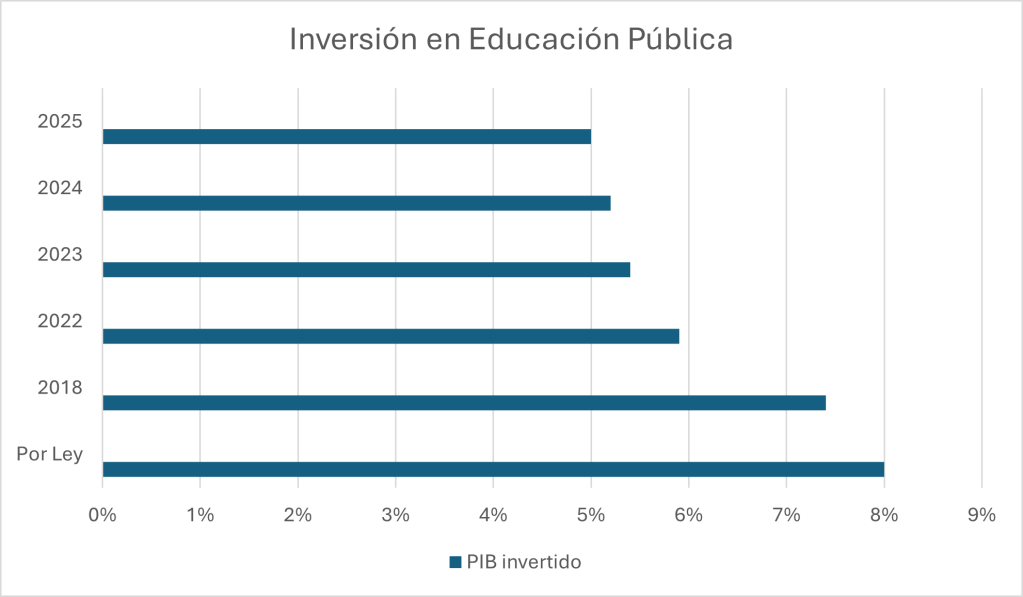 - En el año 2018 el presupuesto fue de 7.40% del PIB, en el 2025 es de 5.0% del PIB, mientras que la ley indica que debe de ser del 8%.