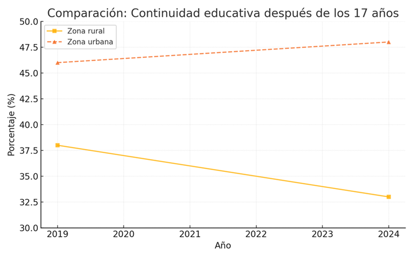 Cuando se lleva la comparativa entre los datos que arroja la zona rural vs zona urbana refleja la inmensa diferencia en los resultados. Un ejemplo es el porcentaje de estudiantes de zona rural que continuó estudiando después de los 17 años, pasó en 2019 del 38% al 33% en 2024, mientras que el porcentaje de estudiantes que continuaron sus estudios en zona urbana pasó de 46% en 2019 a 48% en 2024.