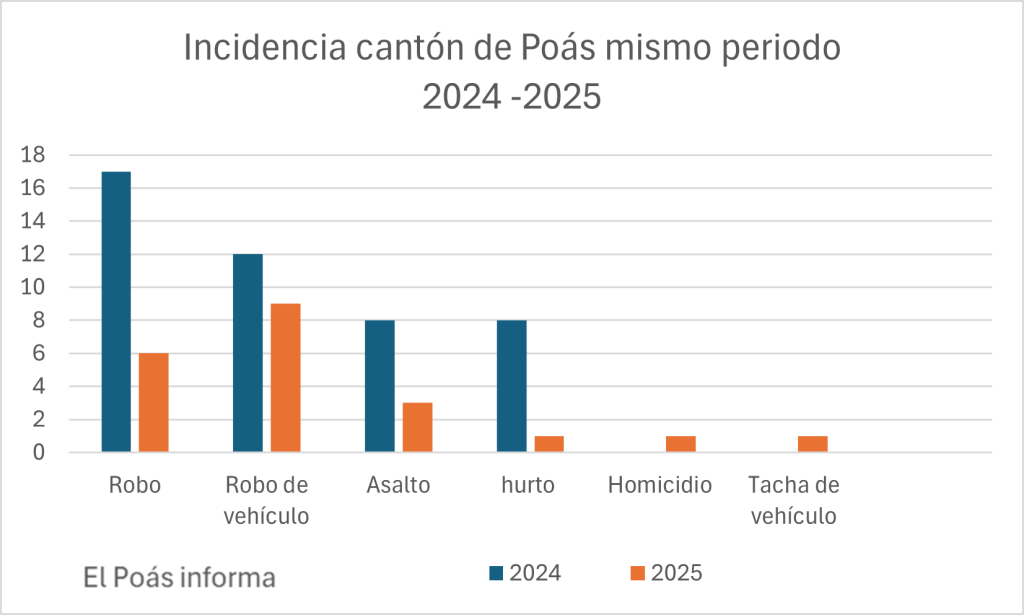 Alajuela, 15 de mayo 2025. El cantón de Poás registra una importante disminución en su estadística criminal según se muestra en la incidencia del OIJ, con más de un 50% de disminución delictiva.