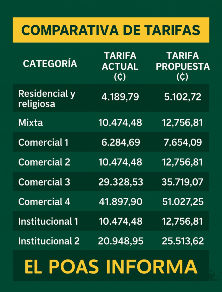 Este cambio afectaría tanto a usuarios residenciales como comerciales e institucionales en todo el cantón. La propuesta será sometida a consulta en una audiencia pública convocada para el lunes 11 de agosto de 2025, a las 5:30 p.m. en la Sala de Sesiones del Concejo Municipal.