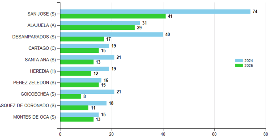 A nivel nacional de enero del 2024 al 15 de setiembre de 2025, se registran 781 casos por este delito, SAN JOSÉ encabeza la lista con 464 denuncias, seguido de HEREDIA con 98 delitos, en la tercera posición se ubicó ALAJUELA con 97 casos.