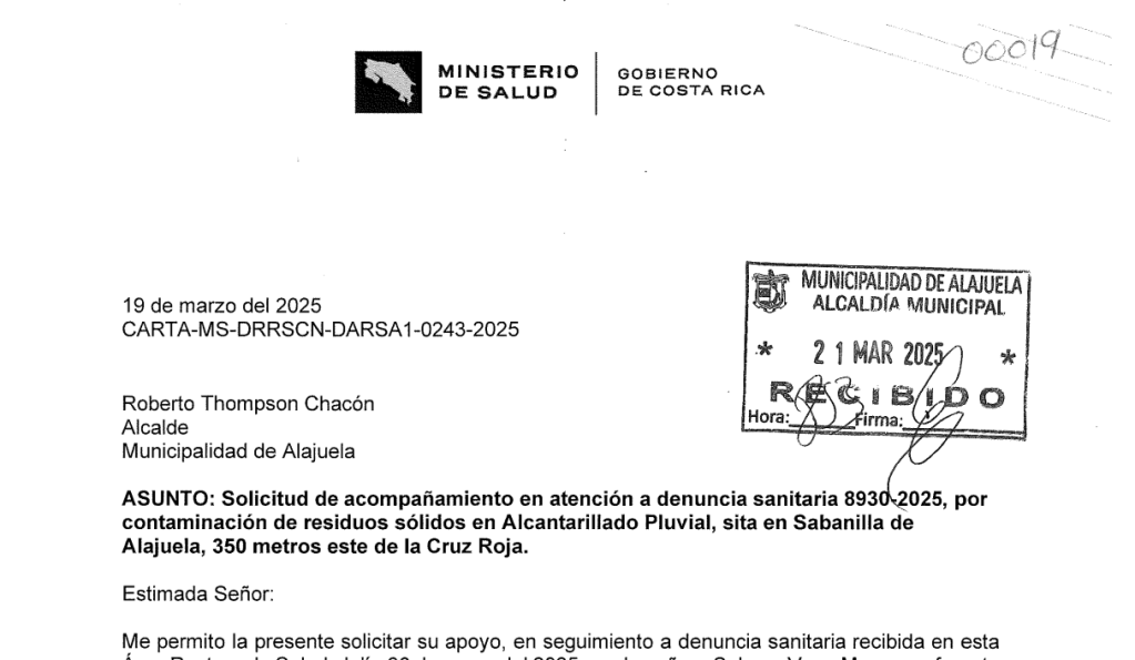 10 de octubre de 2025. La consulta enviada en octubre de 2025 recibió respuesta oficial de la Municipalidad de Alajuela: no hay recursos para la alcantarilla porque “no existen denuncias” . El 19 de marzo de 2025, el Ministerio de Salud le solicitó acompañamiento a la Municipalidad para ver el problema citado, documento municipal —MA-PPCI-0697-2025 y un correo de 2021, , prueban que el departamento encargado conoció el problema y registró obstrucción y daño.