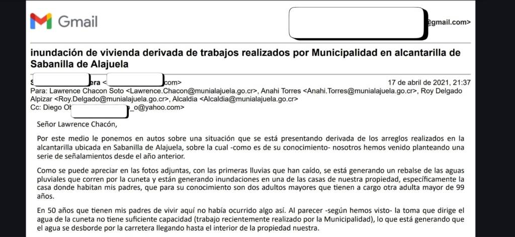 - 17/04/2021. Correo enviado al Ing. Lawrence Chacón reporta inundación tras obras municipales, ingreso de agua a vivienda de adultos mayores y pide acción inmediata. → Existe aviso formal al departamento encargado desde 2021.