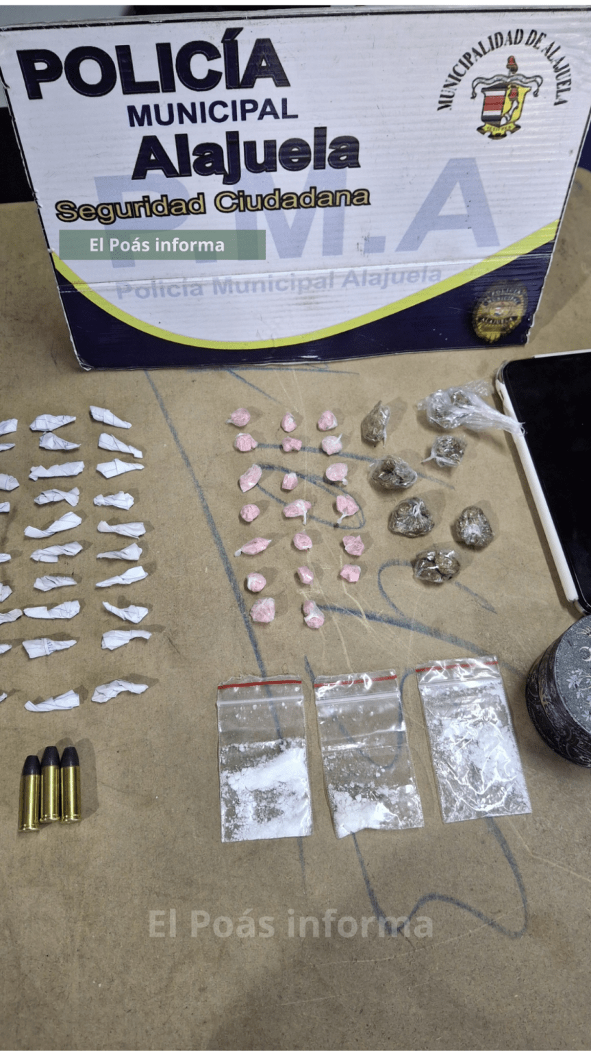 Alajuela, 25 de diciembre 2025. Un hombre de apellidos Chavarría G. de 21 años, es aprehendido esta mañana en Alajuela, portaba decenas de dosis de aparentes drogas tipo cocaína y cocaína rosada (tuzi), así como marihuana en «puchos», la motocicleta en la que viajaba se encontraba completamente irregular, al momento de la intervención de la Policía Municipal de Alajuela (PMA).